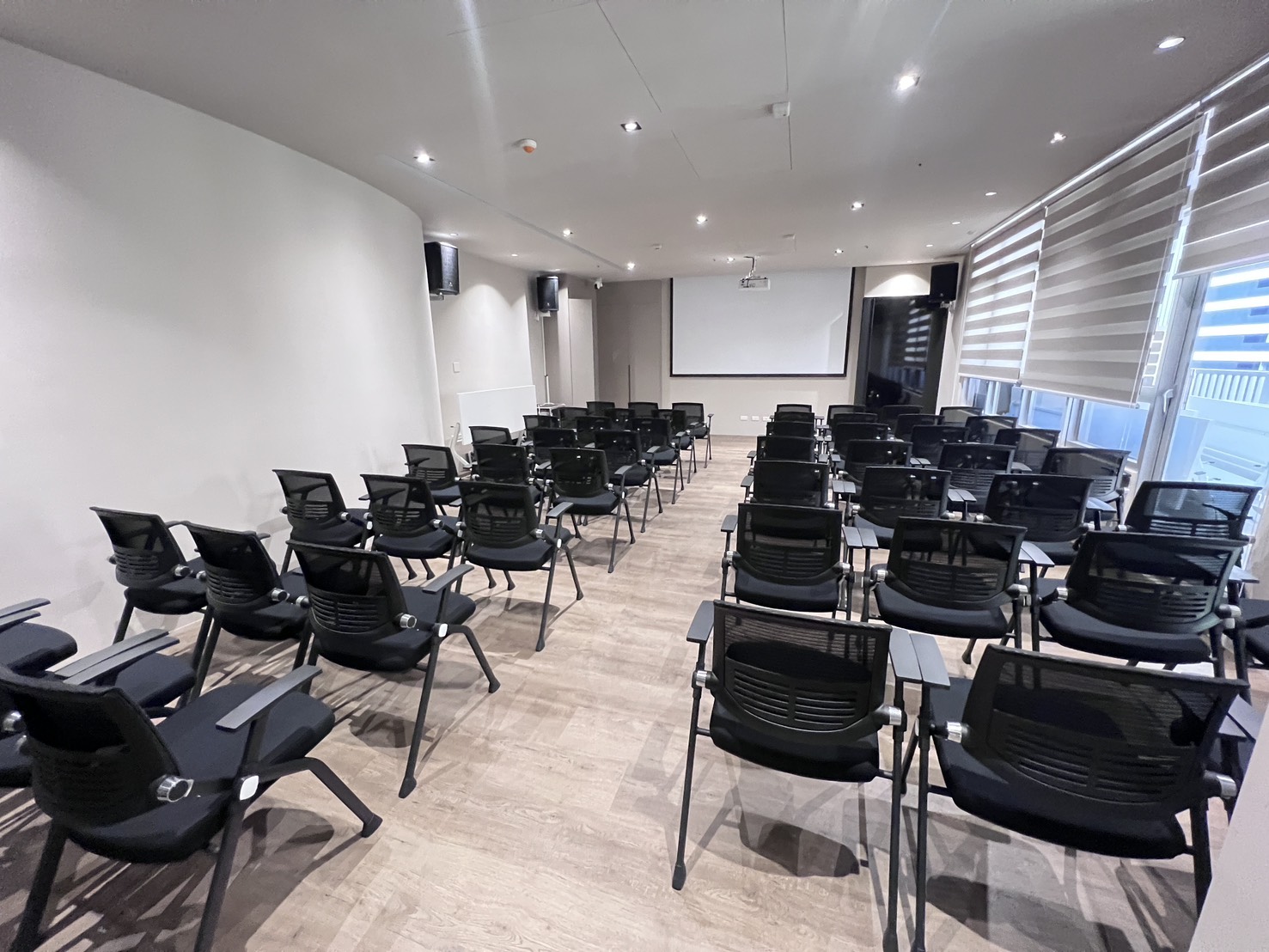 教室租借適用1-40人 - 會議室設有100吋投影布幕,專用投影機、高級皮椅、桌上型麥克風,備有點心茶水。