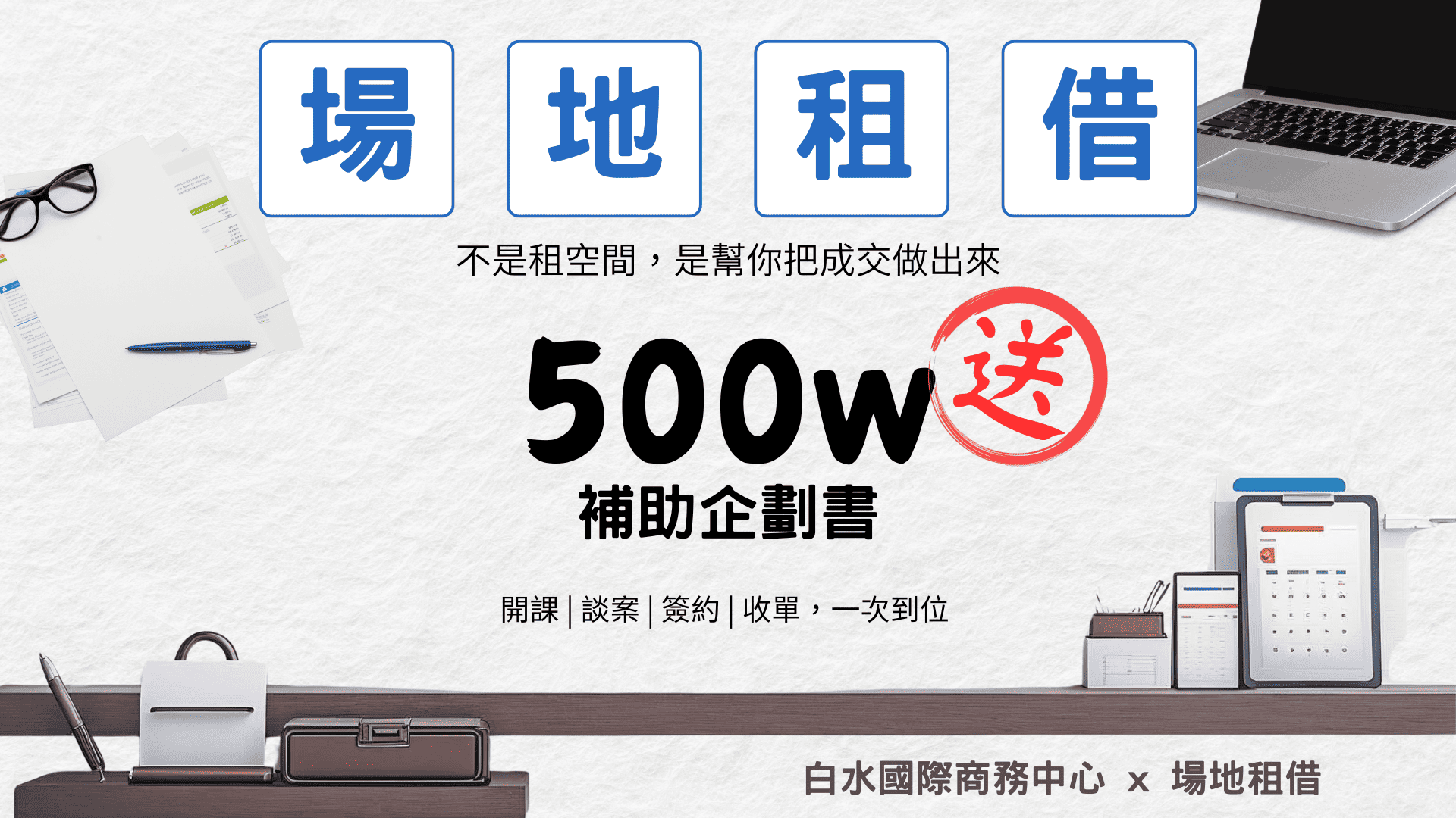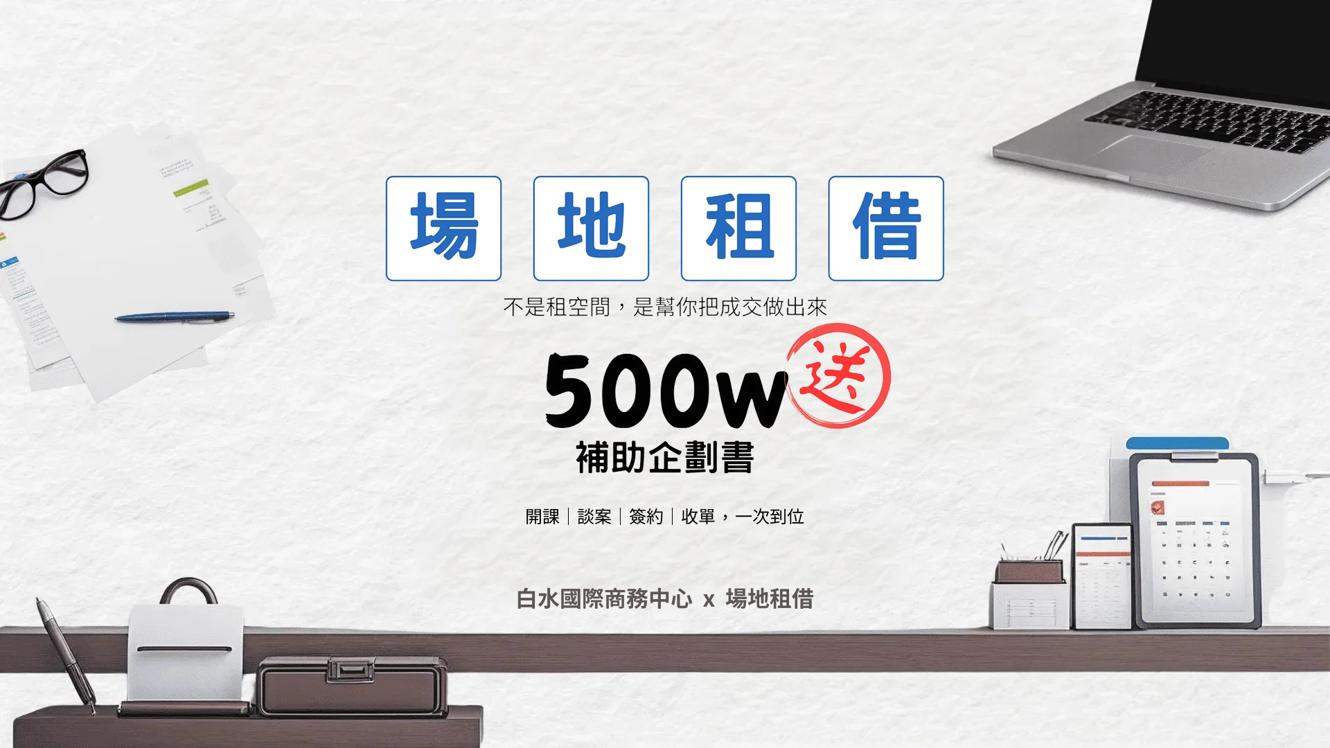 只要租用白水國際商務中心場地一個時段,即贈「500 萬補助計畫書」一份